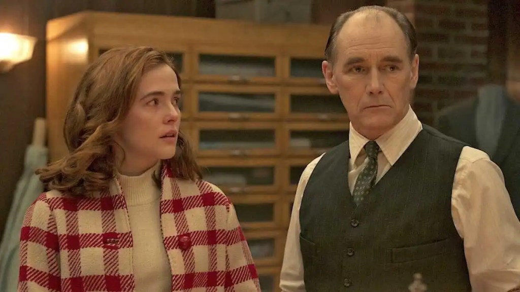 His latest movie The Outfit is one of those movies that you have come to expect from those that stream online. Set in 1956, all of the events occur in a claustrophic vibe in a clothing shop in a Chicago neighborhood owned by the Irish mob where Rylance plays an English cutter, Leonard Burling. His shop is used by mob boss Roy Boyle (Simon Russell Beale) whose son and second-in-command, Richie (Dylan O’Brien) use the shop as a stash house. Richie’s girlfriend, Mable (Zoey Deutch), is also a receptionist for Burling and wants to leave Chicago.