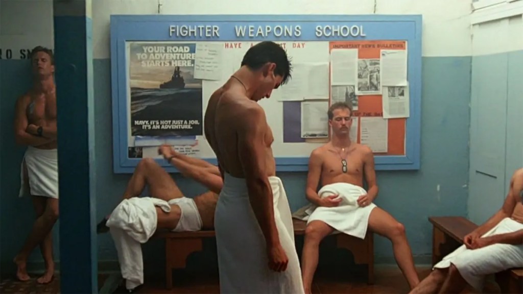 One might argue all the homeroticism is actually just male machismo. Maverick’s biggest rival is Iceman (Val Kilmer). And there are a lot of scenes of them shirtless with only towels covering their bottoms in locker rooms. In one scene where they are face to face, Iceman does a little love bite. (It should be noted at this time that Iceman is probably based on the Marvel character who has since come out as gay.)
