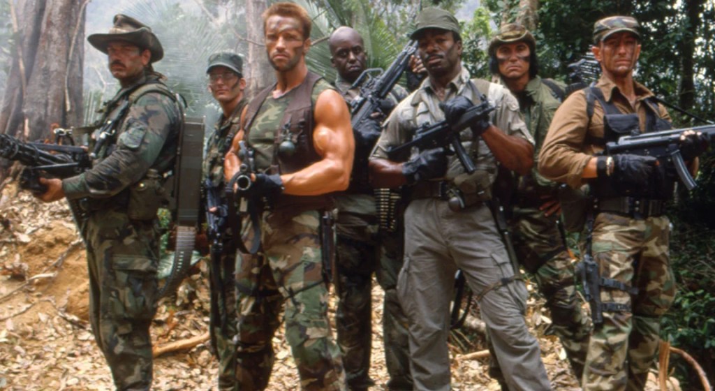 Quite possibly the next on the list is Predator with total homoerotic machismo. I mean, the movie isn’t even a few minutes in before Dutch (Arnold Schwarzenegger) and Dutch (Carl Weathers) do that epic handshake that’s actually a manshake or whatever you want to call it. Then, Dutch kids with him that the CIA has him “pushing too many pencils.” He then mocks him for wearing a tie now.