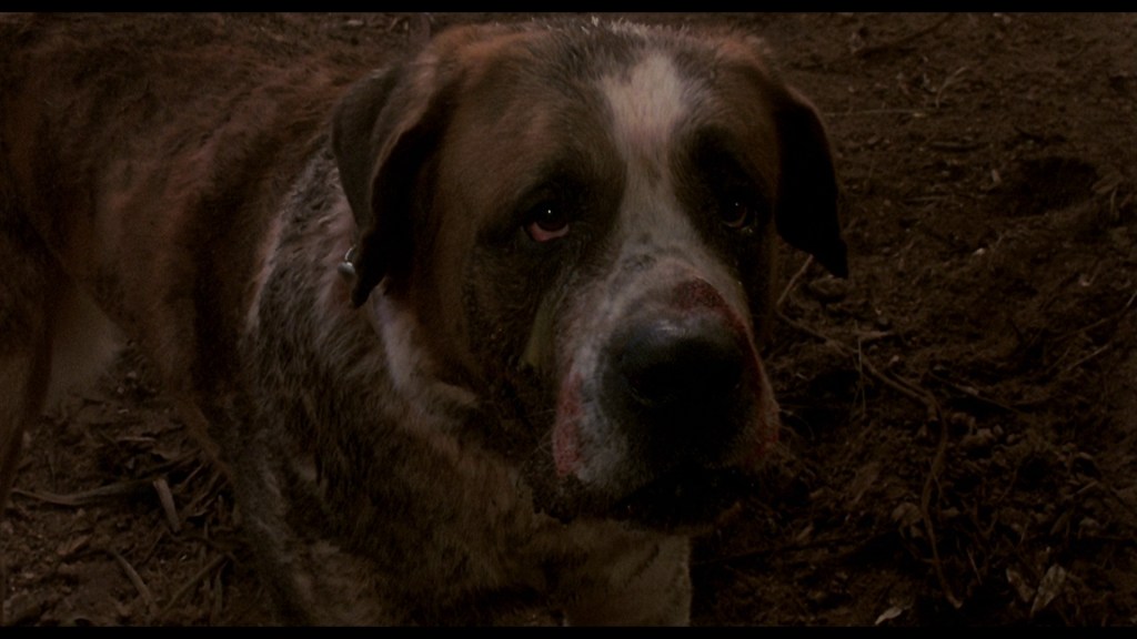 When the movie opens, Cujo (named incorrectly after the Symbionese Liberation Army co-founder Willie Wolfe who prefered to be call “Kahjoh” but mispelled as “Cujo”), is just being a dog. He sees a wild rabbit out in the Maine countryside and does what dogs do and chases after it. He follows it into a hole in the ground that is full of bats. His barking causes them to go wild and one bites him on the nose.