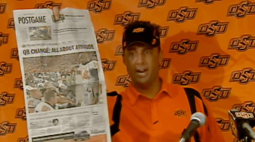 Well, it’s been 15 years to the day Oklahoma State Mike Gundy showed his ass in public. That’s a saying from where I grew up in which someone acts so badly in public over something so trivial. OSU had just won a game against Texas Tech and rather than deliver a press conference which is what everyone had shown up for. He decided to rant and rave against Jenni Carlson, who was and still is a sports columnist for The Oklahoman.