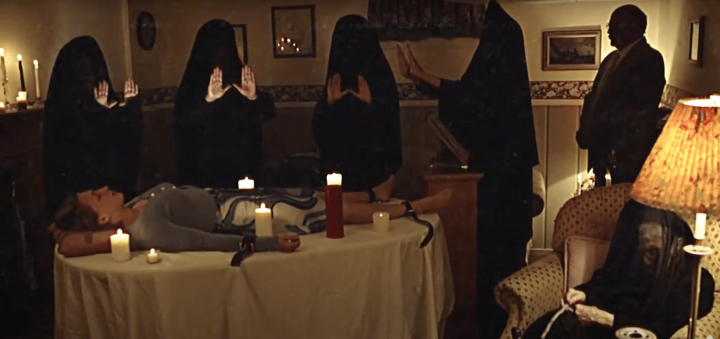 The fifth and final story “To Hell and Back” is the best and it’s the work of Joseph and Vanessa Winter with the former playing Troy, a videographer who has been hired along with his friend, Nate (Archelaus Cristano), to document a coven’s ritual. The vigenette begins innocently with a grandmotherly woman sitting happily with a 2000 mask on and a group of witches who look like a book club preparing the ritual in a basement on New Year’s Eve 1999.