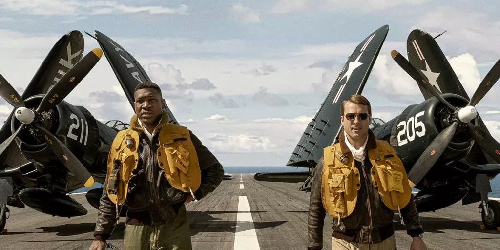 Navy Lt. Tom Hudner (Glen Powell) is transferred to the Fighter Squadron 32 at the Quonset Naval Air Station on the coast of Rhode Island. He meets Ensign Jesse Brown (Jonathan Majors) who is psyching himself up in the mirror by screaming all the hateful comments and racial slurs he’s heard. Majors is the only black man stationed in the unit. There’s some small talk among the others in the squadron that they’re not happy being assigned alongside a “colored” pilot. But Hudner initially passes these comments off as if they don’t phase him.