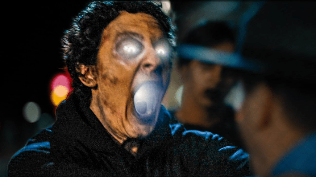 Carver is injured when a prop that theater proprietor Richard Lando (Henry Czerny) had set up accidentally knocks him out. And Lando follows Carver to the hospital, leaving Mike alone to run the box office, projection, and concession mainly because this is a very low-budget movie and they didn’t want to hire another actor even as an extra. Anyway, somehow, the film is haunted and when it rolls, it sets out a force or something that turns the townspeople into zombies.
