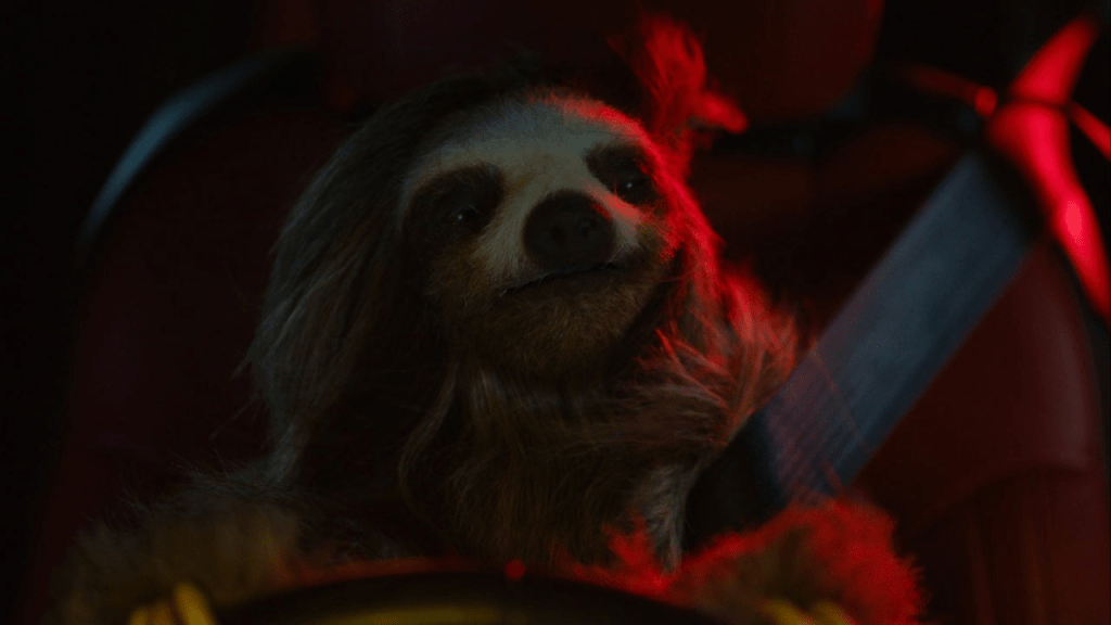 It’s a horror comedy about a killer sloth that uses practical effects. There’s something comical about how the sloth basks in the attention (and even at one point in the sun) and turns to a blood-thirsty monster where it’s operating a car at one time. How a sloth would be able to operate the steering wheel and the gas and brake is impossible. Emily’s roommate, Madison (Olivia Rouyre), seems to be the only one who thinks it’s wrong to have a sloth in a domesticated house. There’s also Zenny (Bianca Beckles-Rose) who the movie hints may or may not be a lesbian or non-binary. Her and Madison seem to be the only ones who don’t fit the stereotypical air-head concept of sorority sisters.