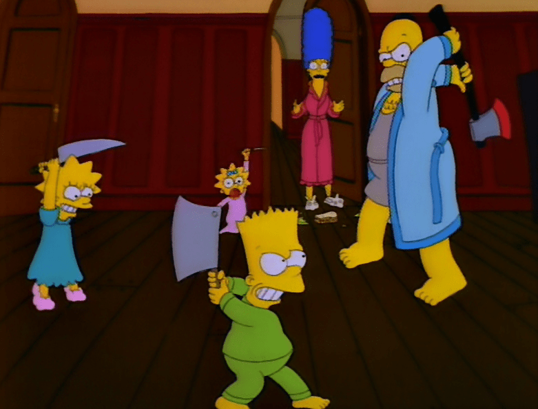 Bart, not to happy with the stories Lisa is telling, begins his own called “Bad Dream House.” This is an ode to the haunted house trope, such as The Amityville Horror or Poltergeist. The Simpsons have moved into a house that is built on a Native American burial ground and experience paranormal activity with a voice even telling them to “Get out!” But Marge (voiced by Julie Kavner) stands her ground and says the evil entity isn’t going to push them around. Realizing it has to live with the Simpsons, it destroys the house by imploding into a portal.