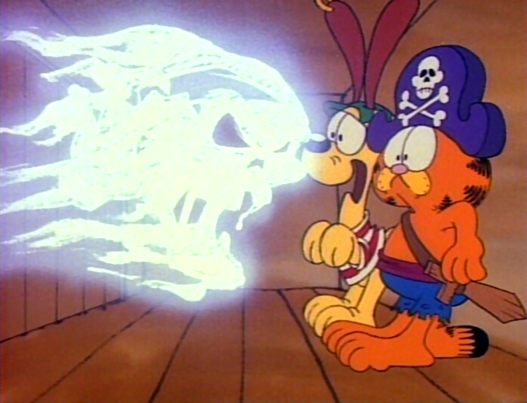 They managed to drift toward land and notice an old house where they go in and discover an elderly creepy man (voiced by C. Lindsay Workman sounding like Christopher Lee) tell them some ghost pirates are coming that night to reclaim some treasure they buried underneath the house 100 years earlier. The switch from a cute, charming story of the furry animals out on Halloween night singing songs (performed by Music and Lou Rawls) to a spooky story is a “nice touch” as Garfield would say.