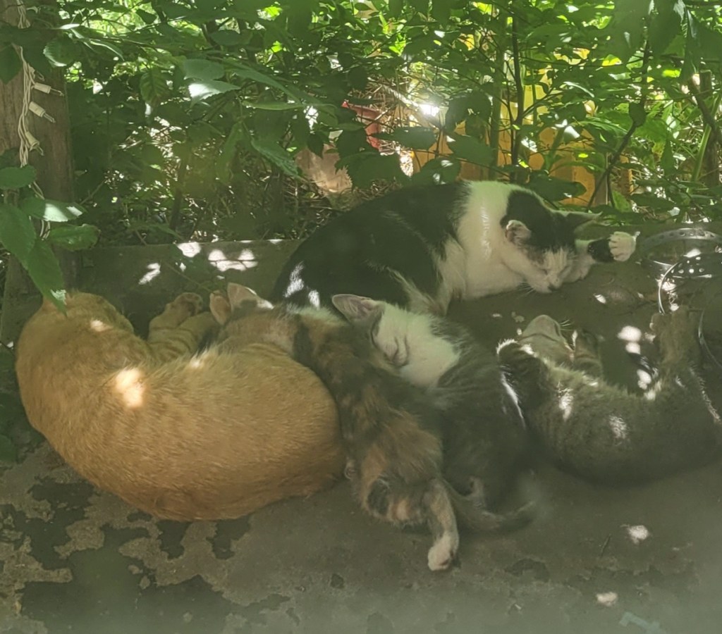 Pepper is what I call the tuxedo cat and she’s the momma. The orange ginger cat I call Stan. About three years ago, another ginger cat who has since crossed Rainbow Bridge, had some babies. I called them after The Golden Girls with the momma ginger being Sophia. And since the ginger is a boy, I called him Stan. Dorothy is the other ginger. There were two other cats I called Rose and Blanche but they’ve gone away too.