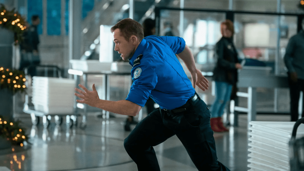 Ethan Kopek (Taron Egerton) is a low-level Transportation Security Agency officer who has become cynical and bored after he failed the LAPD police academy for refusing to mention his father’s criminal history. His live-in girlfriend, Nora Parisi (Sofia Carson), is supportive and encourages him to re-apply. They are both working early on Christmas Eve getting to work before 7 a.m. Nora is a manager at the Northwind Terminal Operations.