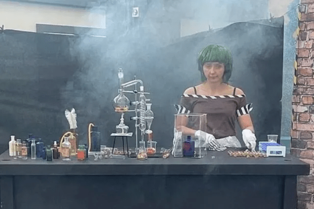 If a picture ever captured something more perfectly, it was taken at Willy’s Chocolate Experience one year ago in Glasgow. A young woman, wearing a green wig, with a bored look on her face standing next to what looked more like a meth lab than a world of pure imagination.