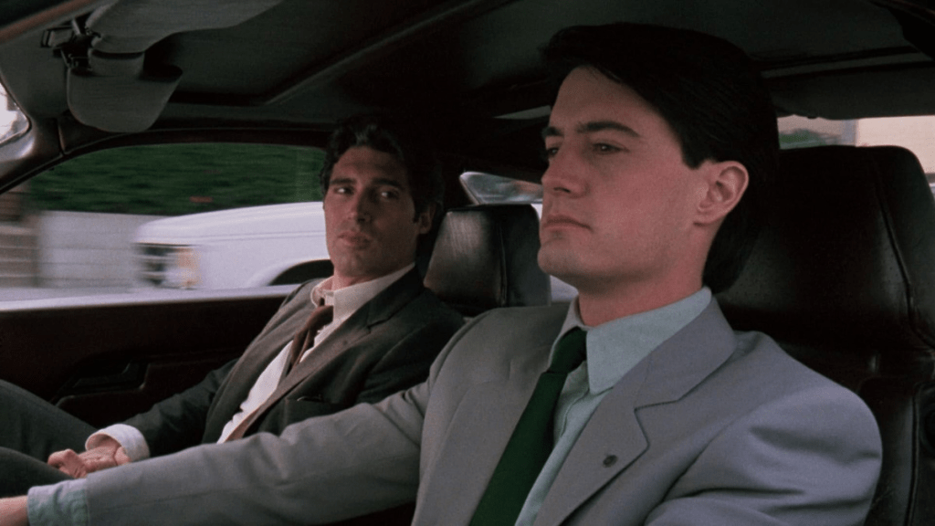 We also suspect something is off about Gallagher. Maclachlan would later use this character style as part of his iconic role as Agent Dale Cooper on Twin Peaks. He looks very serious but seems to have some bewilderment to little things.