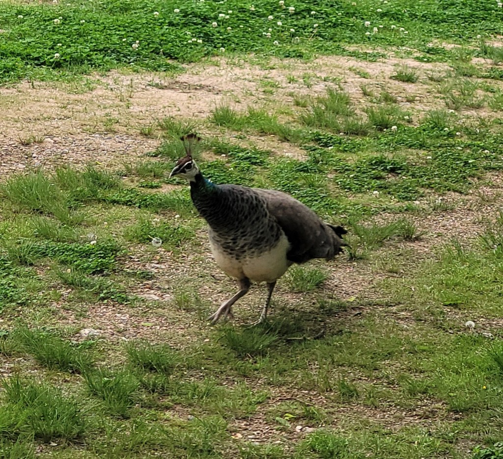 I went and got it some old Cheerios I fed the birds. But they like the dry cat food better and so did the peahen. So I grabbed a small handful and tossed the food toward the fowl who gobbled it up.
